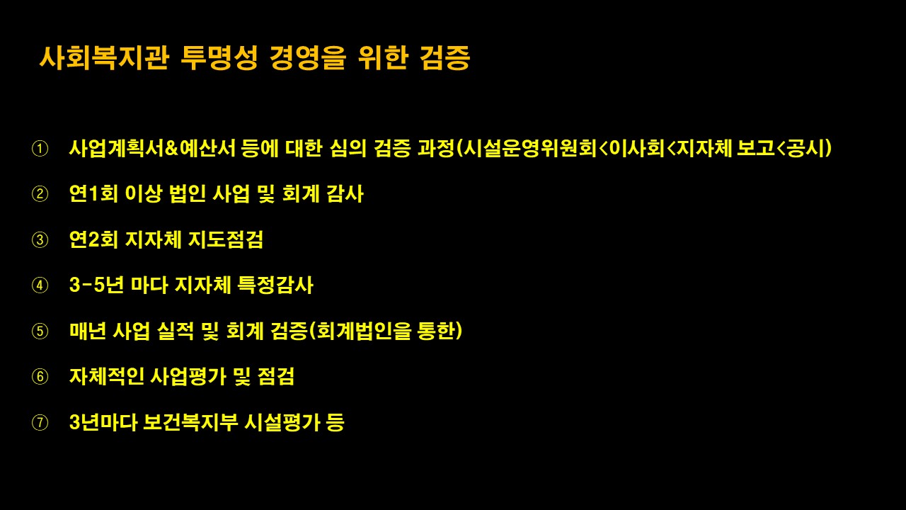 이러한 다양한 점검과 평가를 통해 사회복지기관의 전문성과 투명성 등을 입증하고 있으며