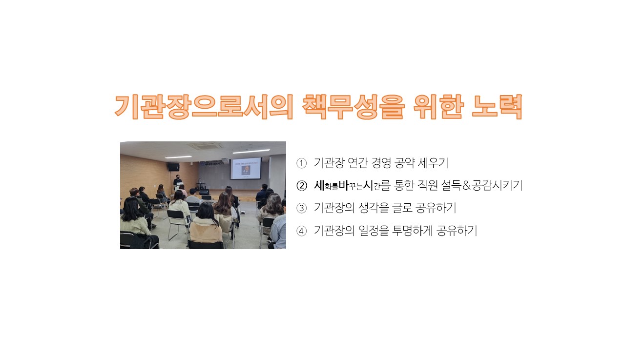 초임 기관장 시절부터 스스로 실행하고자 노력하던 것들이 있었습니다.