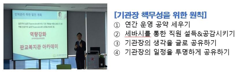 그래서 초임 기관장이 되던 시기부터 스스로 책무성을 다하기 위한 노력으로 16년차 기관장이지만