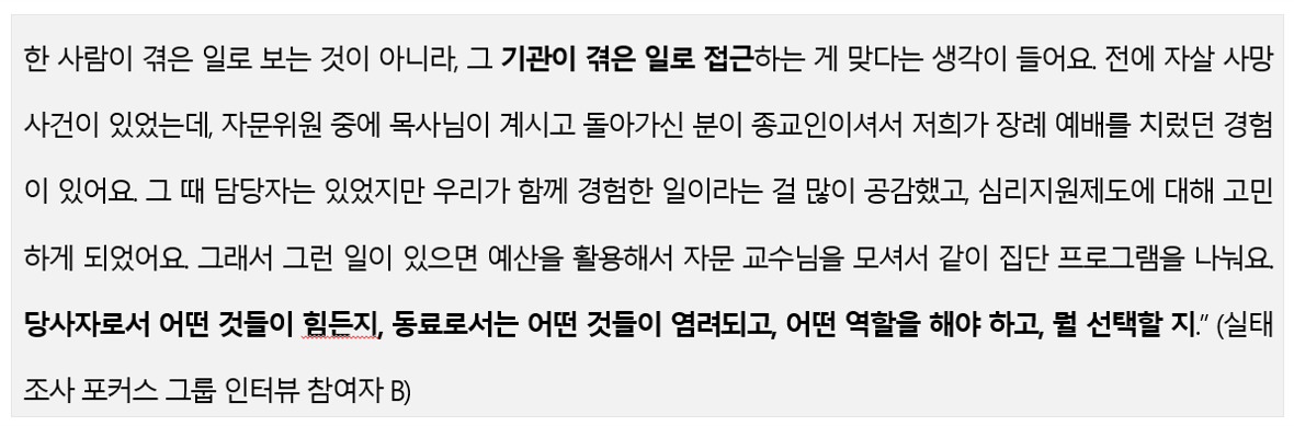 자살사건 발생 후 기관이 종사자를 지원하고 애도문화를 구축한 사례 |