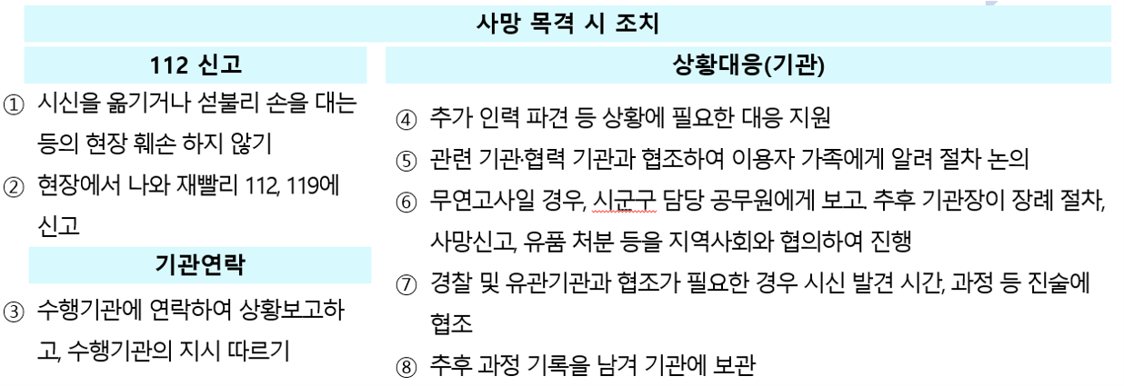 무연고사일 경우, 시군구담당 공무원에게 보고. 추후 기관장이 장례 절차, 사망신고, 유품 처분 등을 지역사회와 협의하여 진행
