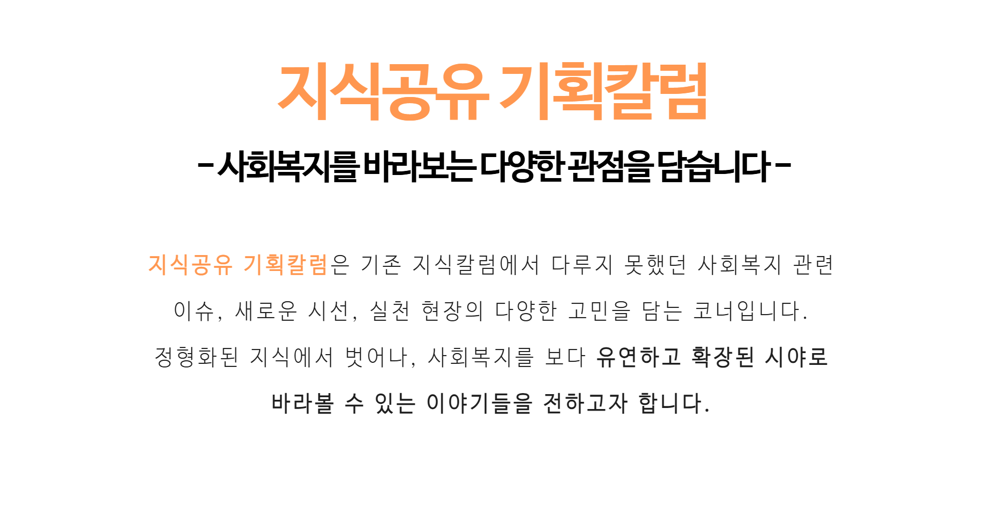 지식공유 기획칼럼은 기존 지식칼럼에서 다루지 못했던 사회복지 관련 이슈, 새로운 시선, 실천 현장의 다양한 고민을 담는 코너입니다. 정형화된 지식에서 벗어나, 사회복지를 보다 유연하고 확장된 시야로 바라볼 수 있는 이야기들을 전하고자 합니다.
