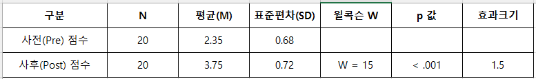 | 사전(Post) 점수 | 20 | 3.75 | 0.72 | W = 15 | < .001 | 1.5 |