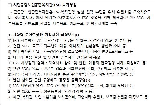 숙의 과정을 통해 ESG복지경영을 구조화한 것으로 보인다. 무엇보다 실천 전략 수립을 위해
