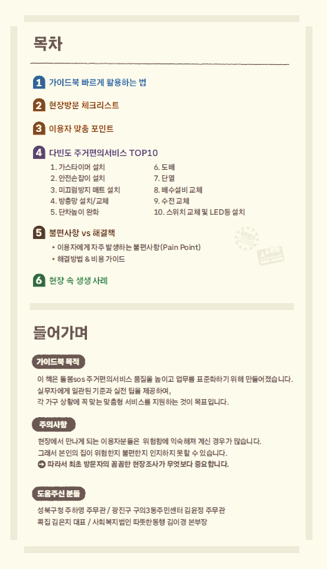 이 책은 돌봄sos 주거편의서비스 품질을 높이고 업무를 표준화하기 위해 만들어졌습니다. 실무자에게 일관된 기준과 실전 팁을 제공하여, 각 가구 상황에 꼭 맞는 맞춤형 서비스를 지원하는 것이 목표입니다.