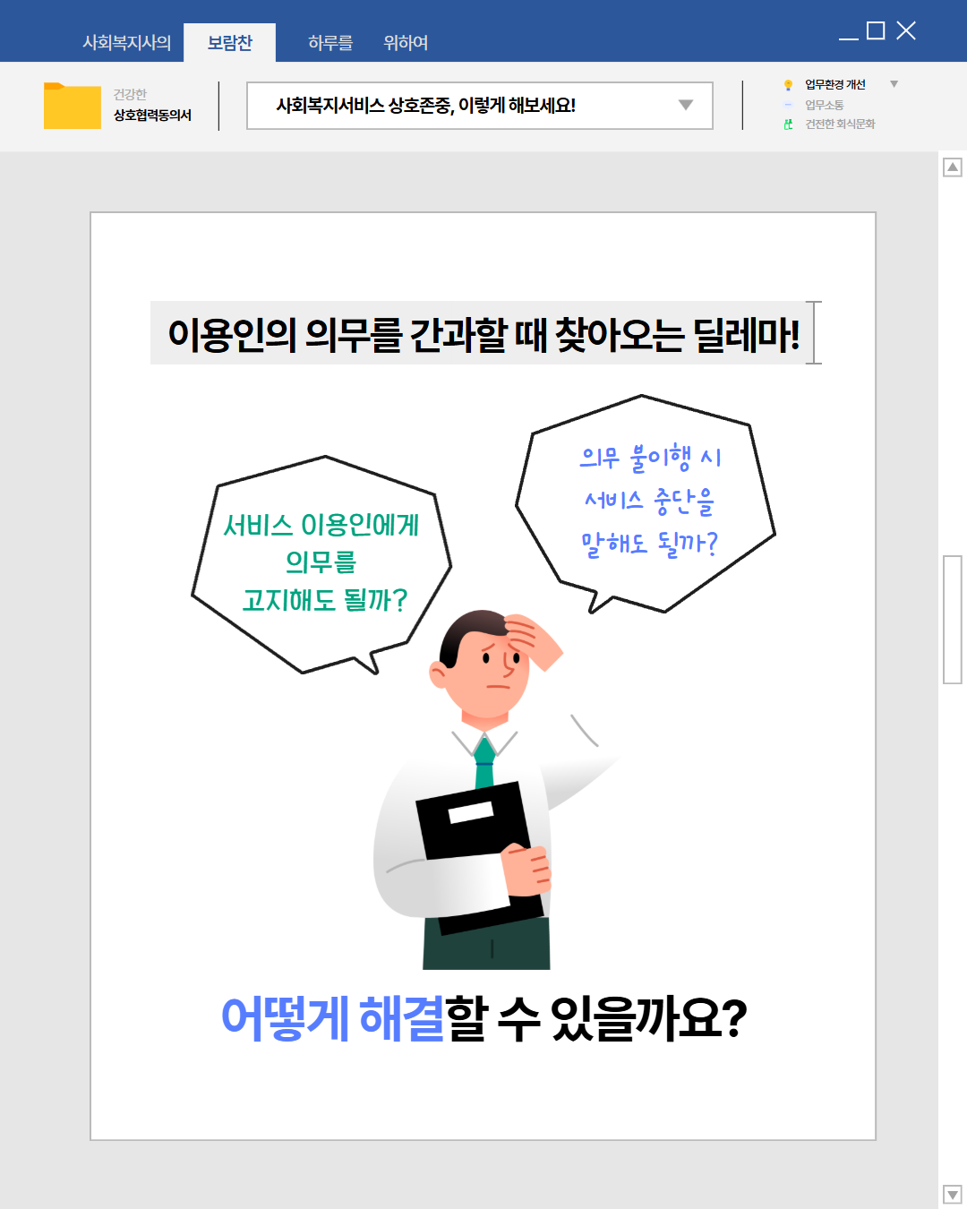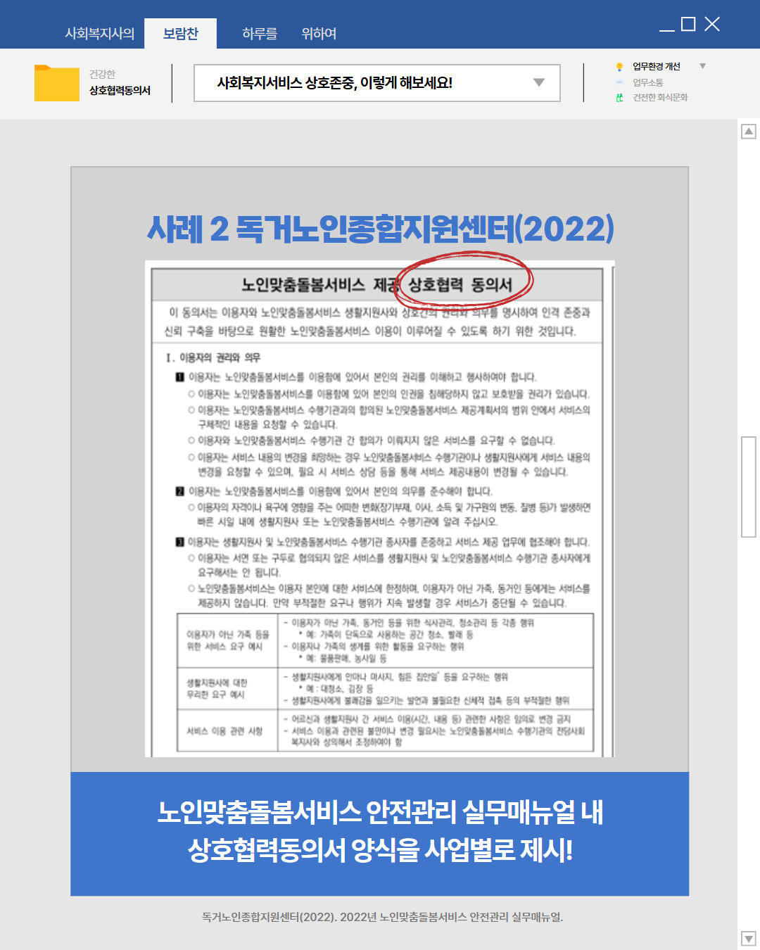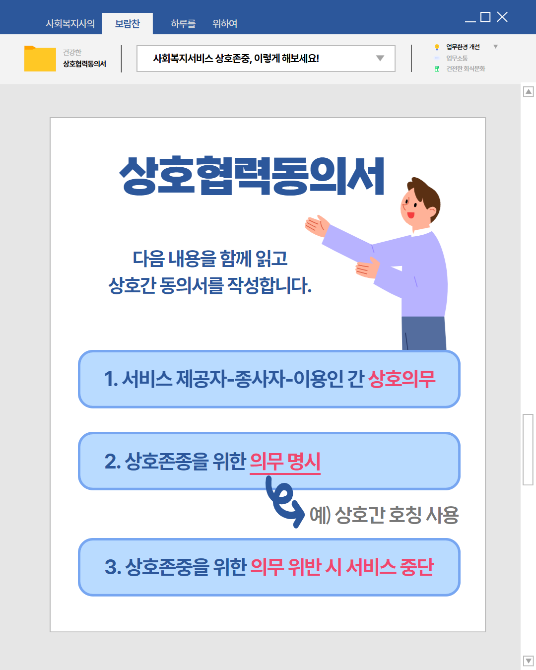 좋은 서비스가 안정적이고 지속적으로 제공되기 위해서는 ‘서비스 제공기관’과 ‘이용인(보호자와 가족)’ 모두의 노력이 필요한 것이죠.