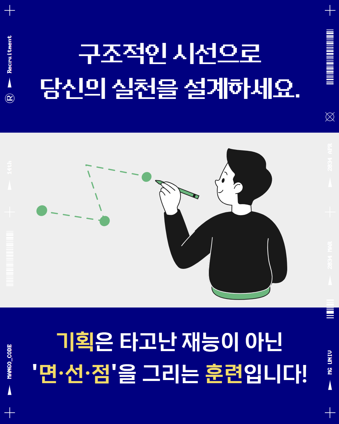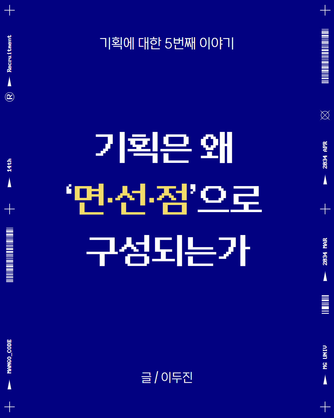 기획은 복잡한 틀이나 공식으로 오해되지만, 실제 기획은 ‘실천의 구조’로 설명할 수 있습니다. 이 흐름을 시각적으로 표현한 것이 바로 ‘면(面)–선(線)–점(點)’ 구조인데요.