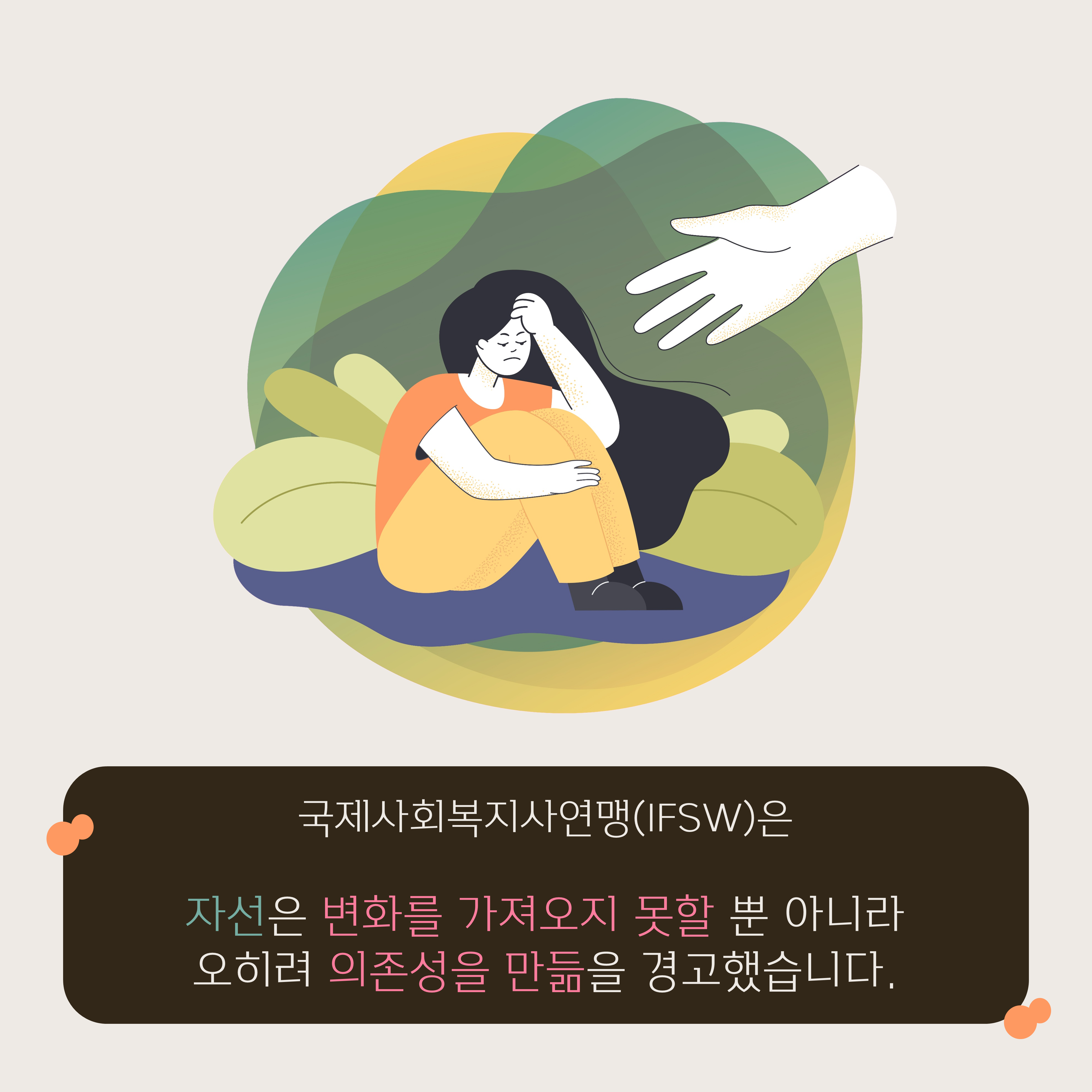 국제사회복지사연맹(IFSW)은 자선은 변화를 가져오지 못할 뿐 아니라 오히려 의존성을 만들 뿐임을 경고했는데요.