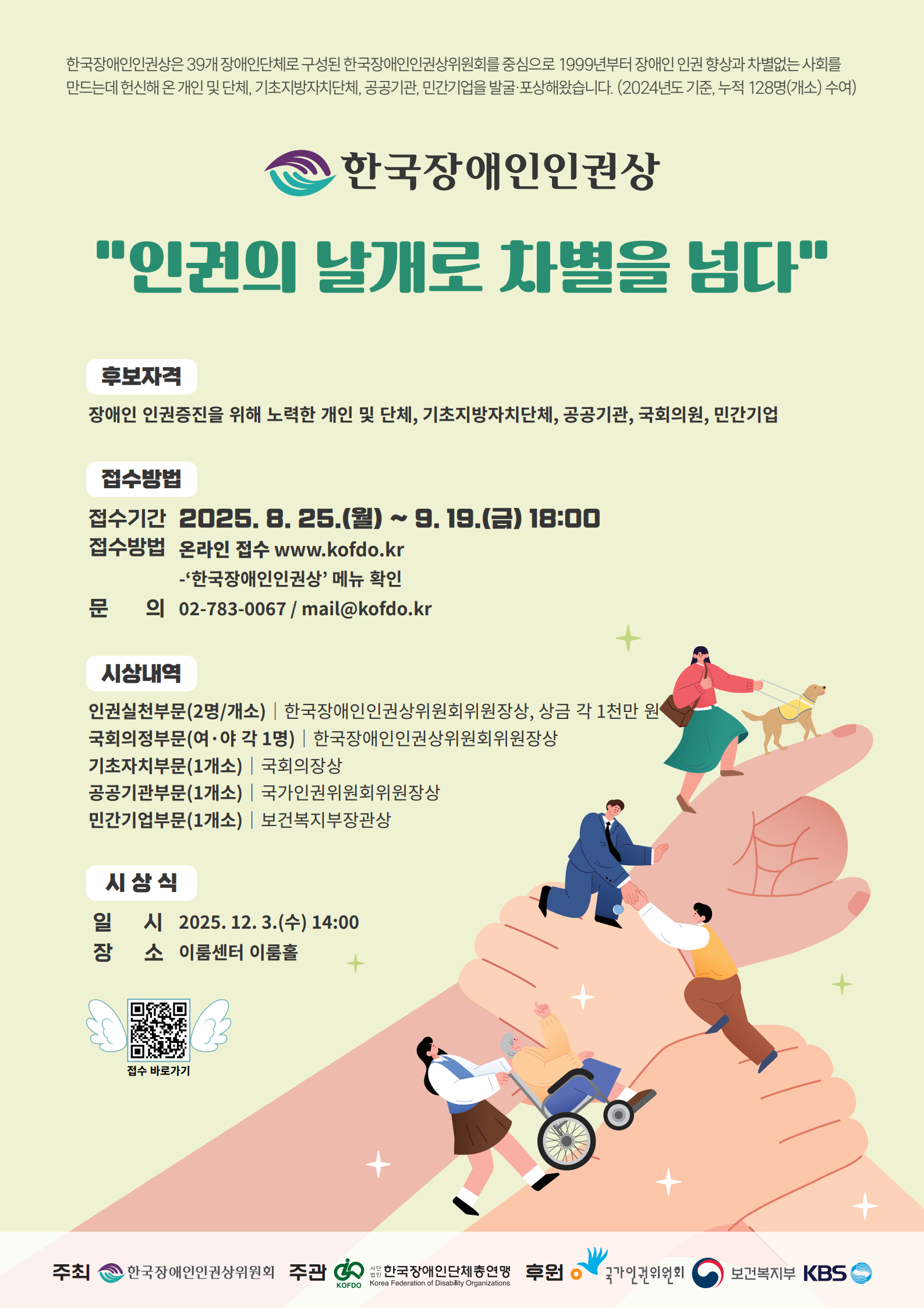 모집 대상: 장애인 인권 증진에 기여한 개인 및 단체, 국회의원, 기초지방자치단체, 공공기관, 국회의원, 민간기업