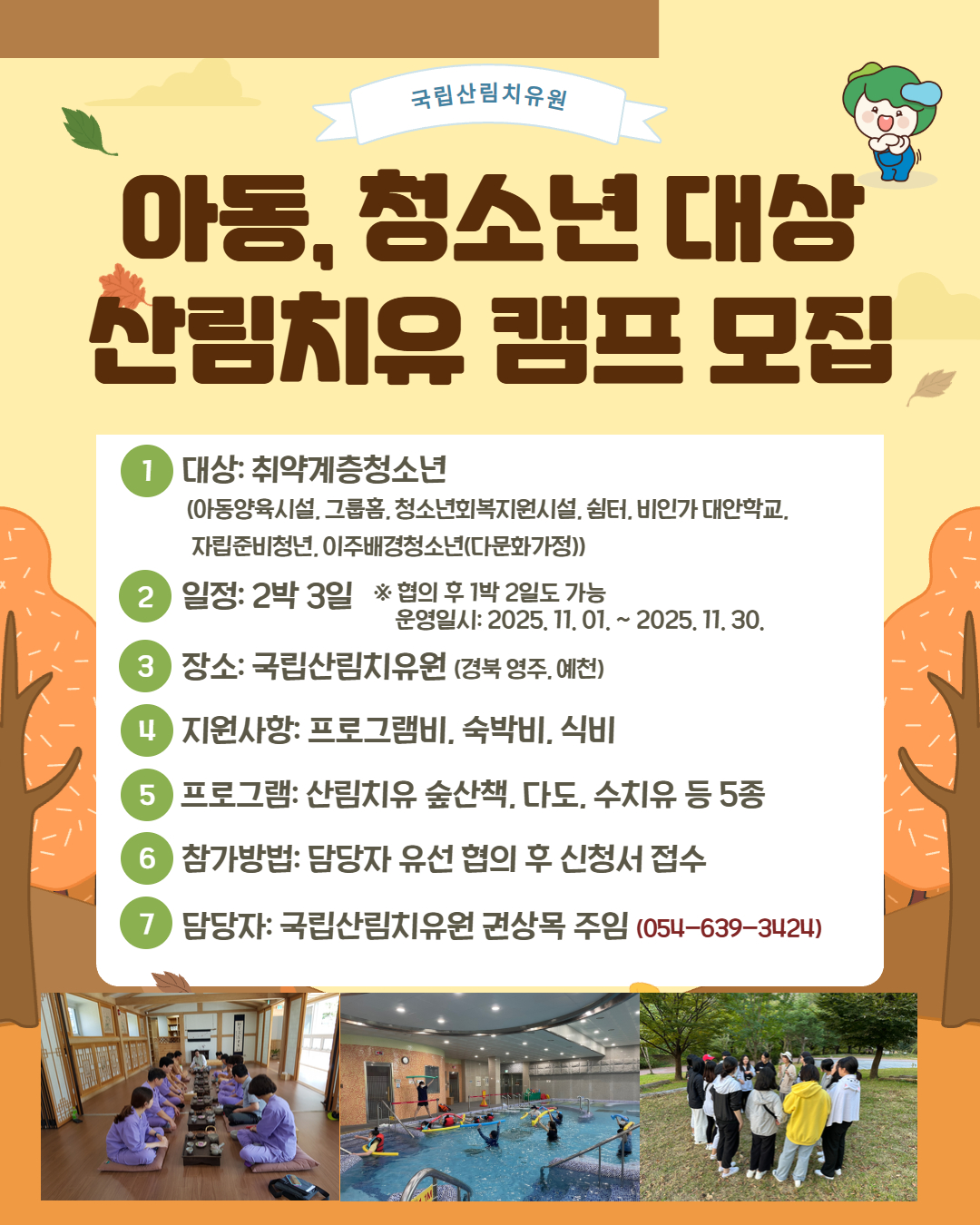 오는 11월 아동 및 청소년을 대상으로 한 산림치유캠프 참가자를 모집하고자 합니다.