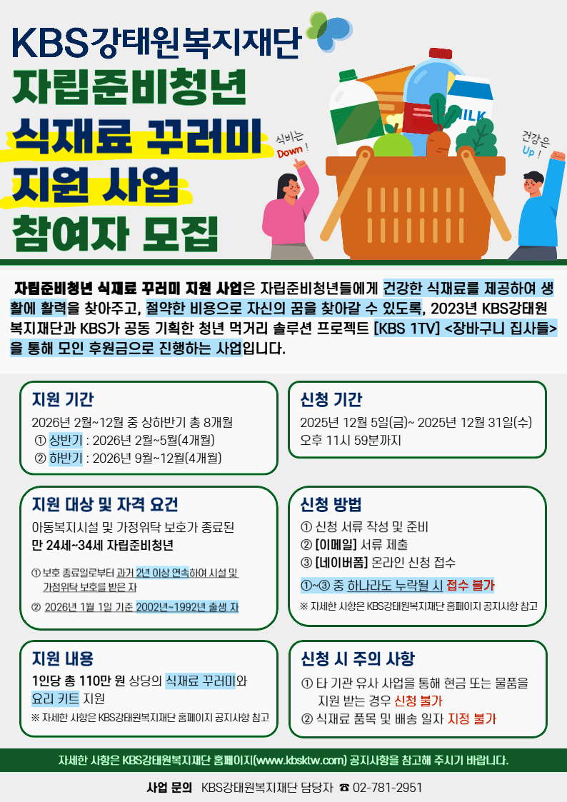 KBS강태원복지재단 자립준비청년 식재료 꾸러미 지원 사업 참여자 모집