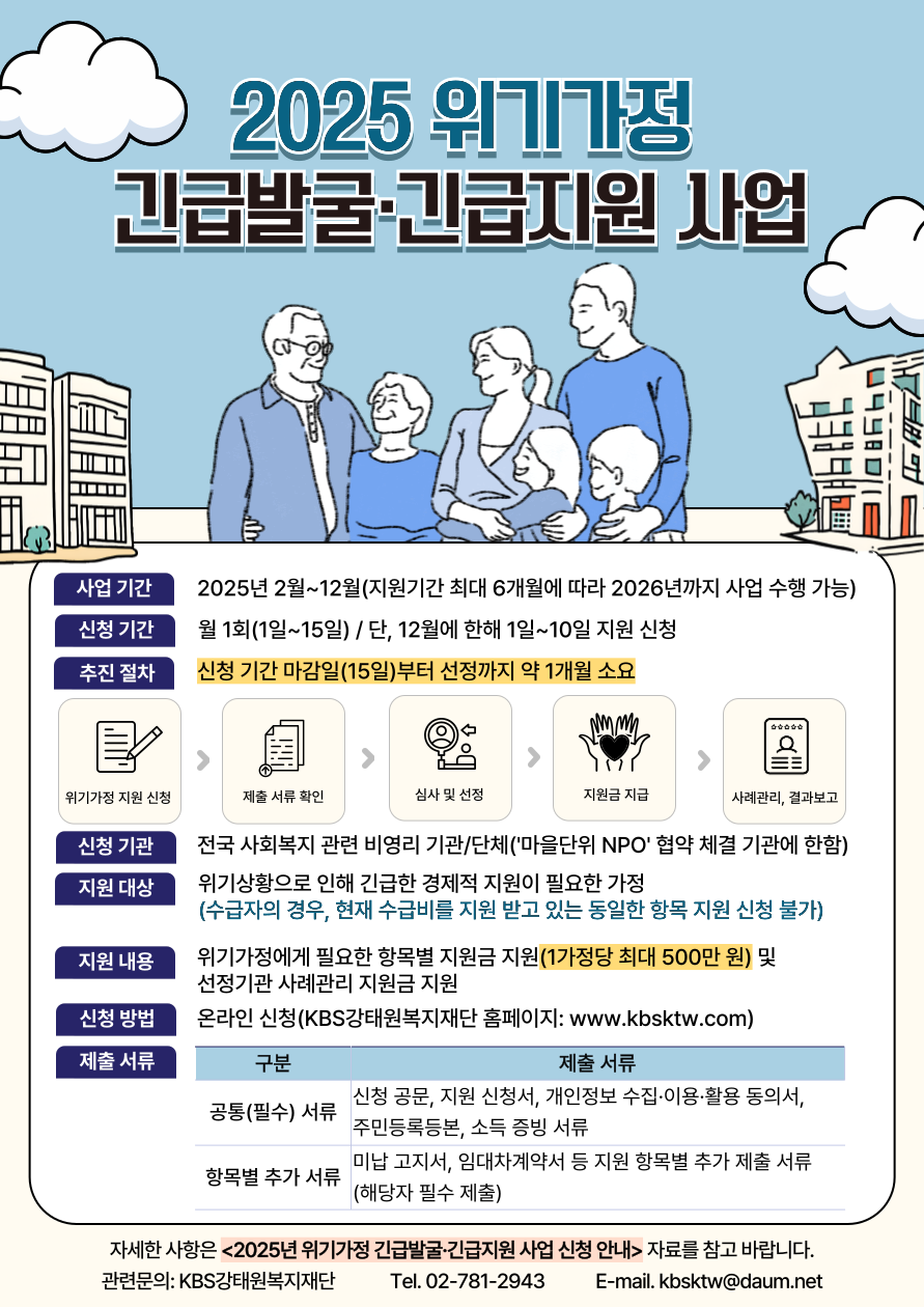 자세한 사항은 <2025년 위기가정 긴급발굴•긴급지원 사업 신청 안내> 자료를 참고 바랍니다.