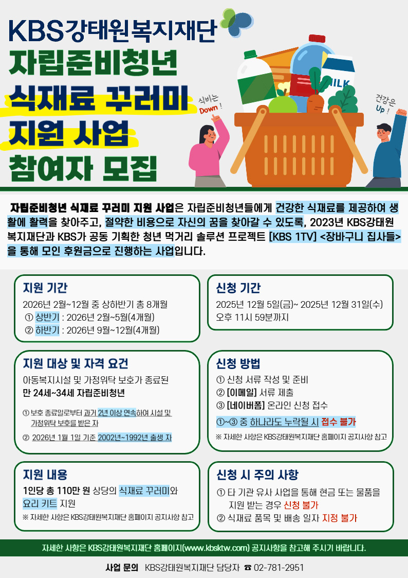 KBS강태원복지재단은 자립준비청년의 건강한 자립 생활을 응원하며, 아래와 같이 식재료 지원 사업을 진행합니다.