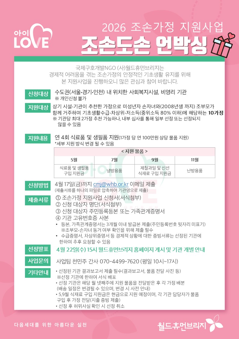 2026년 월드휴먼브리지 조손가정 지원사업 "조손도손 언박싱!" 사업공모 안내
