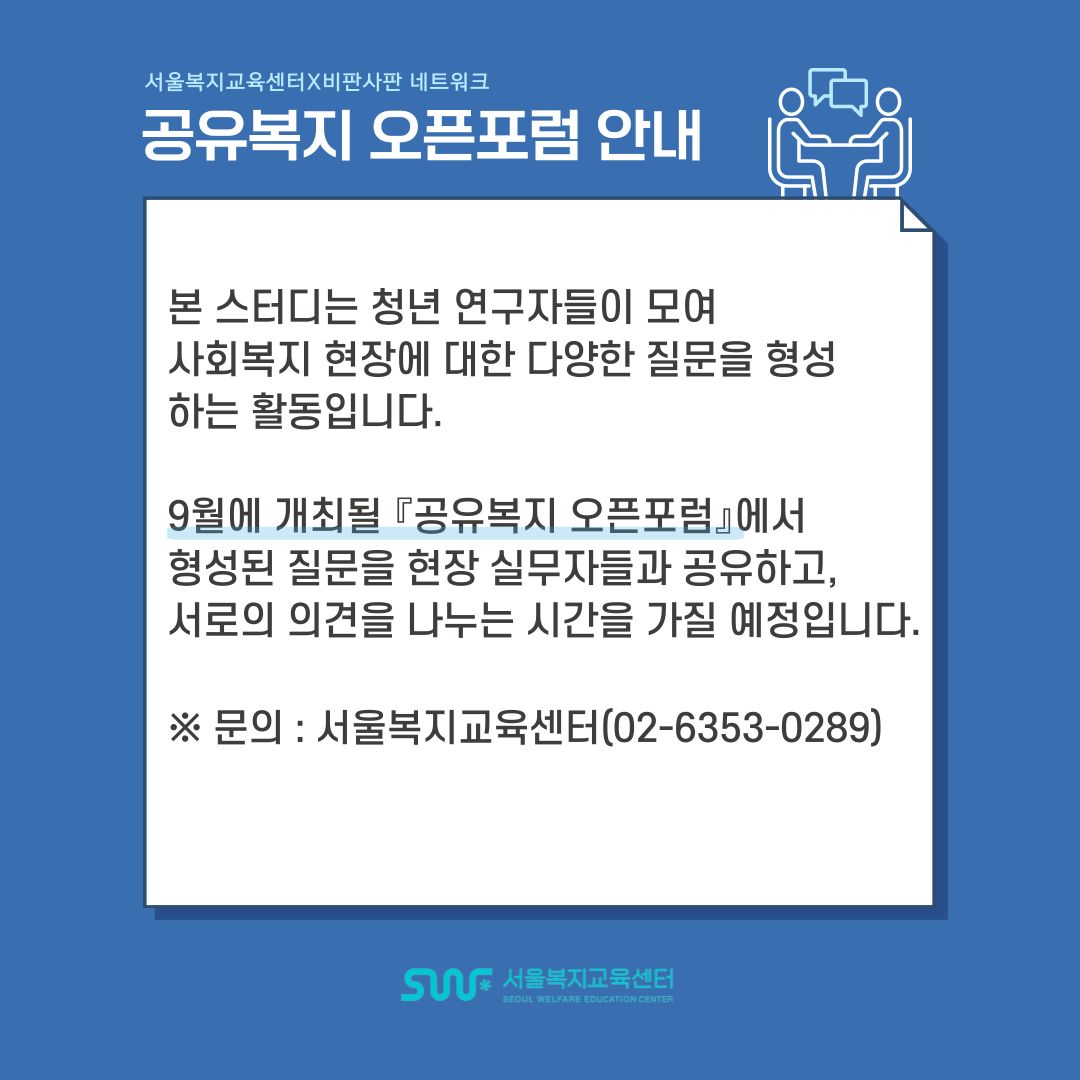 서울시복지재단 서울복지교육센터 × 비판복지학회 비판사판네트워크 “공유복지 오픈포럼”
